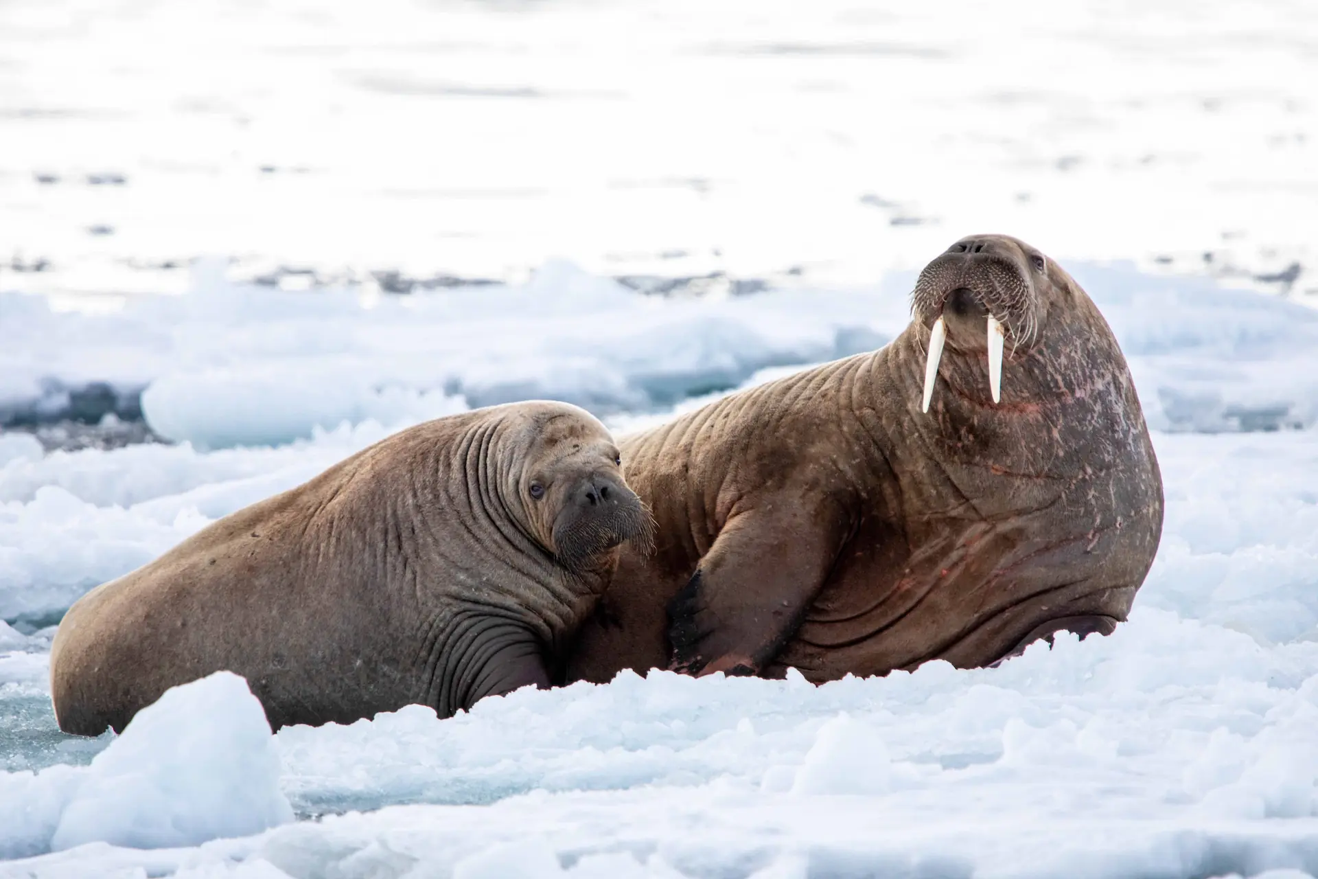 Walruses have a few other adaptations that make them well-suited to the icy Arctic. They have thick layers of blubber that keep them insulated in the frigid waters. They also have 400-700 highly sensitive whiskers on their face, called vibrissae, that they use to feel along the seafloor for buried food.